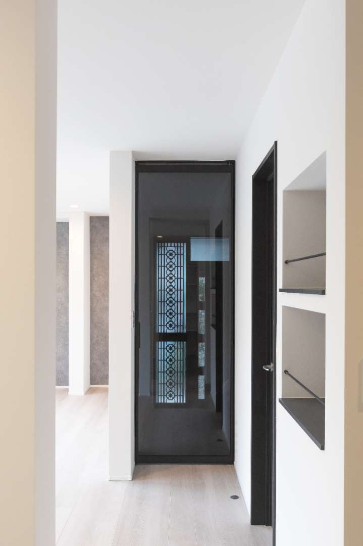 グレーのガラス戸と細いシンプルなフレームがスタイリッシュな雰囲気を出しています。