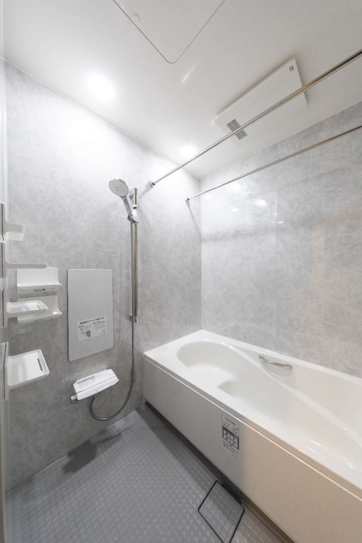 全体的に明るいながらも落ち着いた空間になるよう、床はグレージュでアクセントには濃い石目グレーをチョイス。
